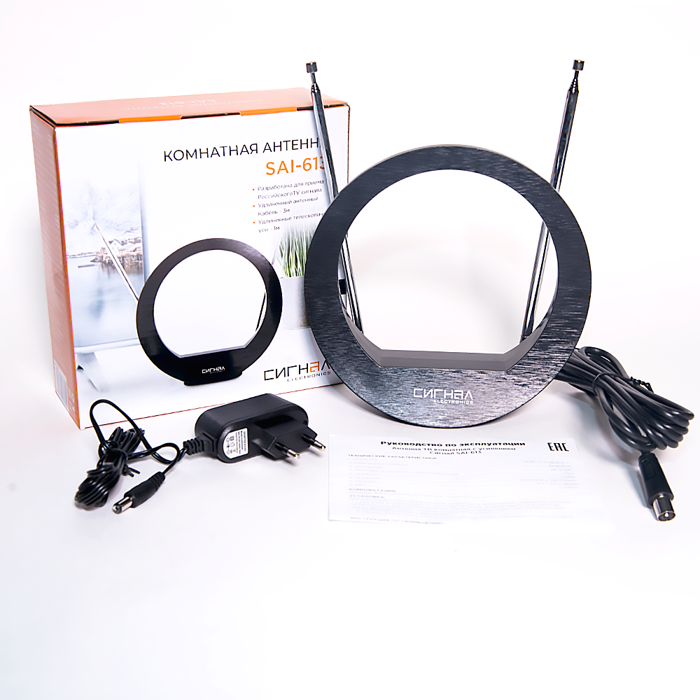 Обратите внимание на антенны линейки «Сигнал» разработанные для приема Российского TV-сигнала, антенны, просты и удобны в использовании. Выделяются на полке за счет необычного и стильного дизайна, а так же яркой упаковки. Телевизионная комнатная антенна «Сигнал» SAI-613 для просмотра цифрового и аналогового телевидения выполнена из пластика. Данную антенну можно разместить в наиболее удобном месте в зависимости от уровня сигнала, потому как SAI-613 имеет кабель длиною 3 метра. Принимает сигнал в диапазонах ДМВ, FM, DVB-T, DVB-T2. Частота приема сигнала ДМВ (470-862)MHz. Антенна по типу усиления активная. Имеет встроенный усилитель, поэтому обладает отличным приемом сигнала, как в горизонтальной, так и в вертикальной плоскости. Коэффициент усиления составляет 26-30dB. Питание от блока питания 220В/50Гц, 5В/100мА, размер антенны 177х65х180мм.