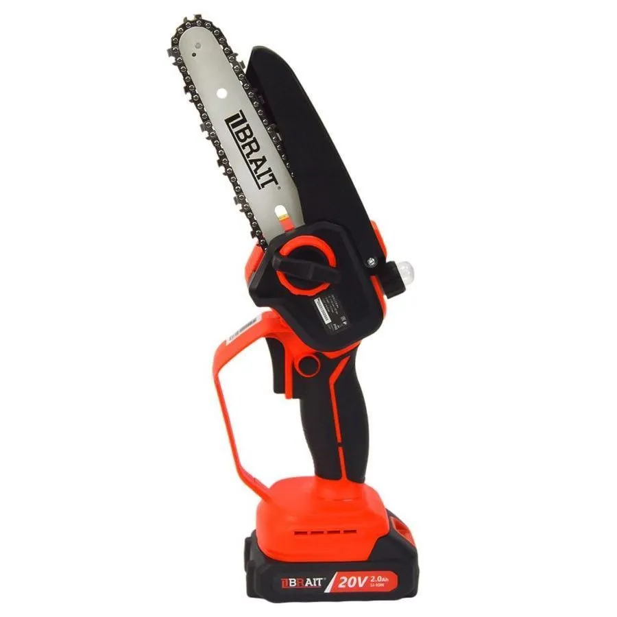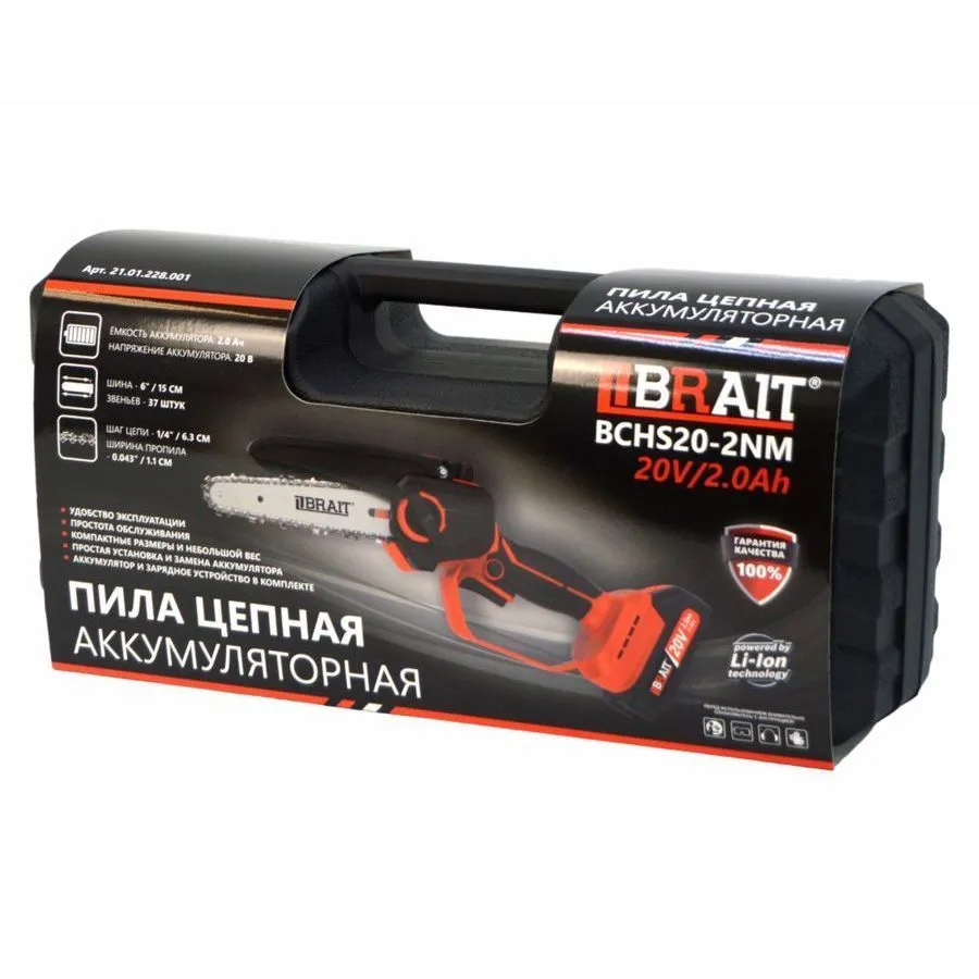 Пила цепная аккумуляторная BRAIT BCHS20-2NM сочетает в себе сверхкомпактный дизайн, высокую производительность и надежность. Используется на садовых и приусадебных участках для распила стволов, веток деревьев, бревен и других лесоматериалов. Распиловка возможна как в продольном, так и в поперечном направлении. Скорость пиления 6м/сек при работе с сучьями среднего диаметра. Ручной инструмент очень легок и мобилен. Вес пилы 2,1 кг. Она не привязана к розетке. Аккумулятора емкостью 2 А*ч и напряжением в 20 В. Аккумуляторная цепная пила удобно лежит в руке благодаря прорезиненной рукоятке. Для безопасности оператора предусмотрены защита от случайного пуска и защитный кожух цепи. В модели BCHS20-2NM длина шины составляет 6 дюймов ( 15 см ) под цепь из 37 звеньев с шагом ¼. Ее необходимо смазывать каждые 10 - 15 пропилов, т.к. инструмент оснащен ручной смазкой цепи.