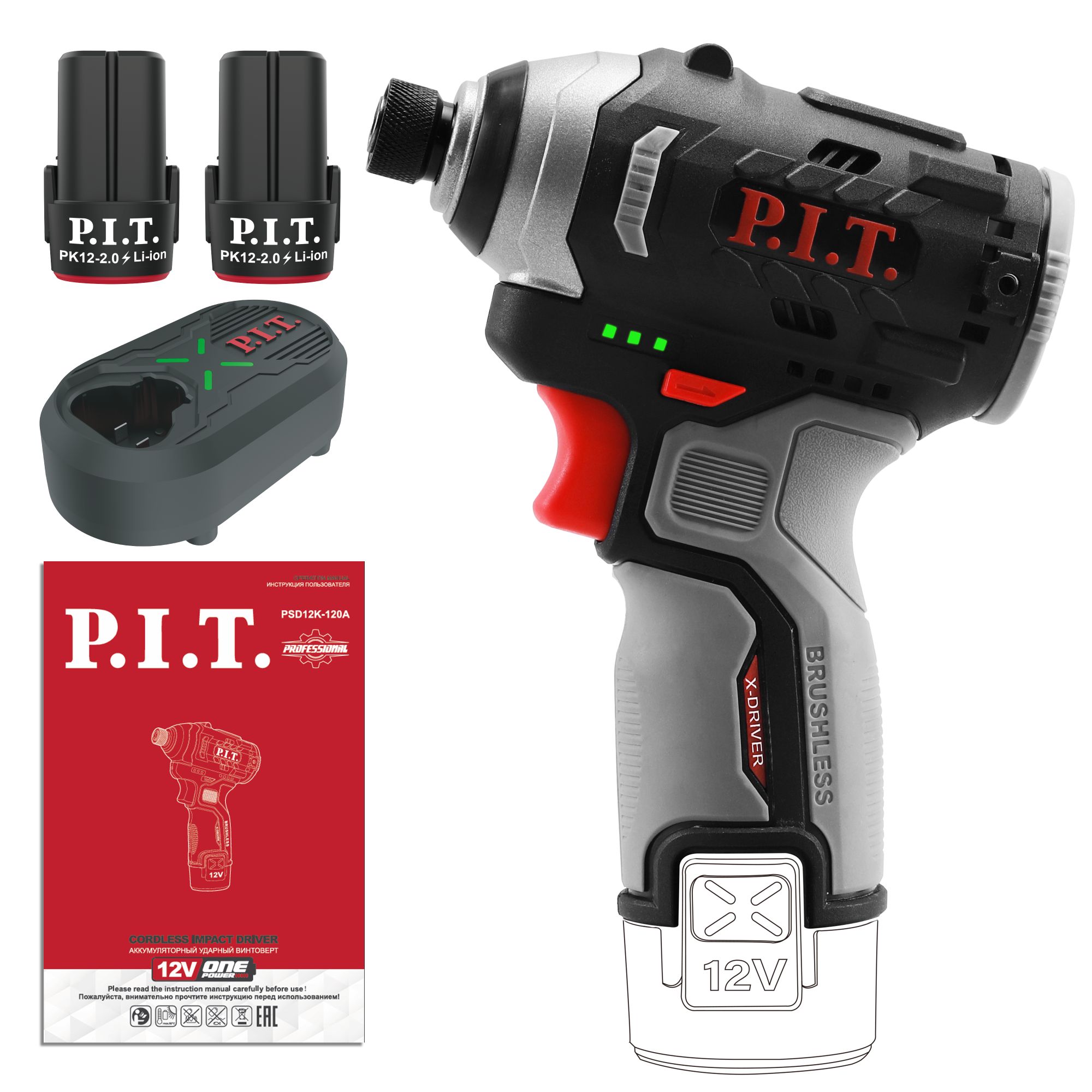 Винтоверт IMPACT аккум. бесщёточный P.I.T. PSD12K-120A/2 (12В, 120Нм, 3ск, HEX 1/4, 2х2Ач, ЗУ,кейс)