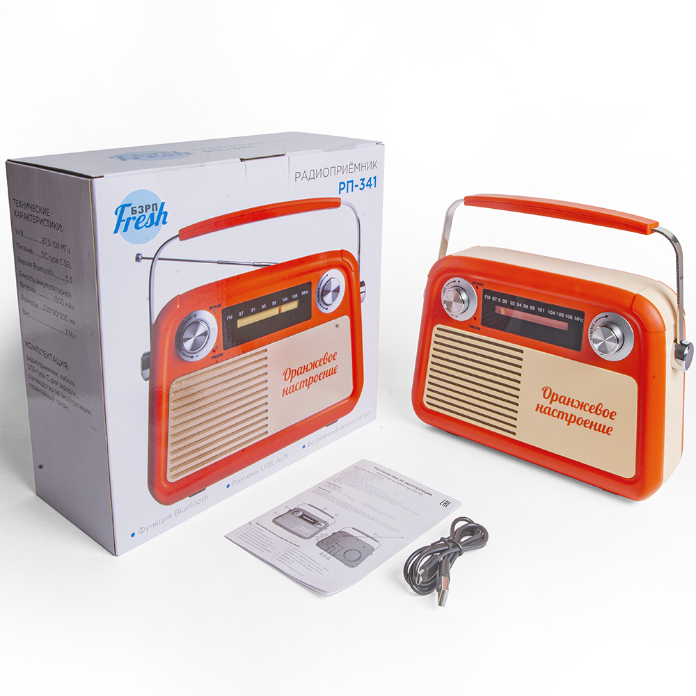 БЗРП Fresh РП-341 – радиоприемник в оранжевом цвете. На фасаде имеется запоминающаяся надпись: «Оранжевое настроение». Свой ретро внешний вид радио сочетает с актуальными функциями внутри. Благодаря Bluetooth соединению можно подключаться и использовать приемник как колонку. USB порт позволяет воспроизводить любимые композиции в любом месте, на любой удаленности от связи. AUX вход дает возможность соединения с различными источниками звука.